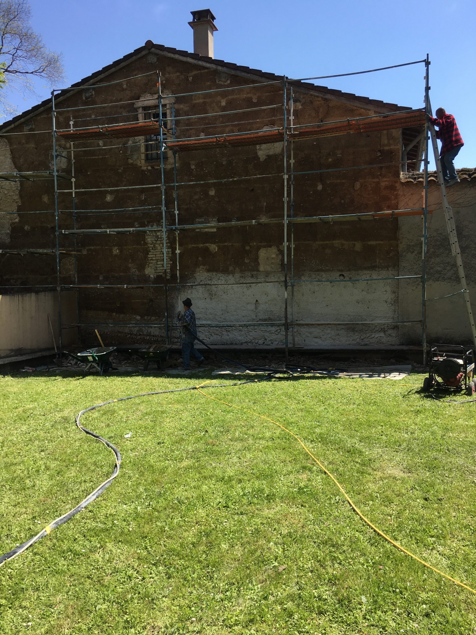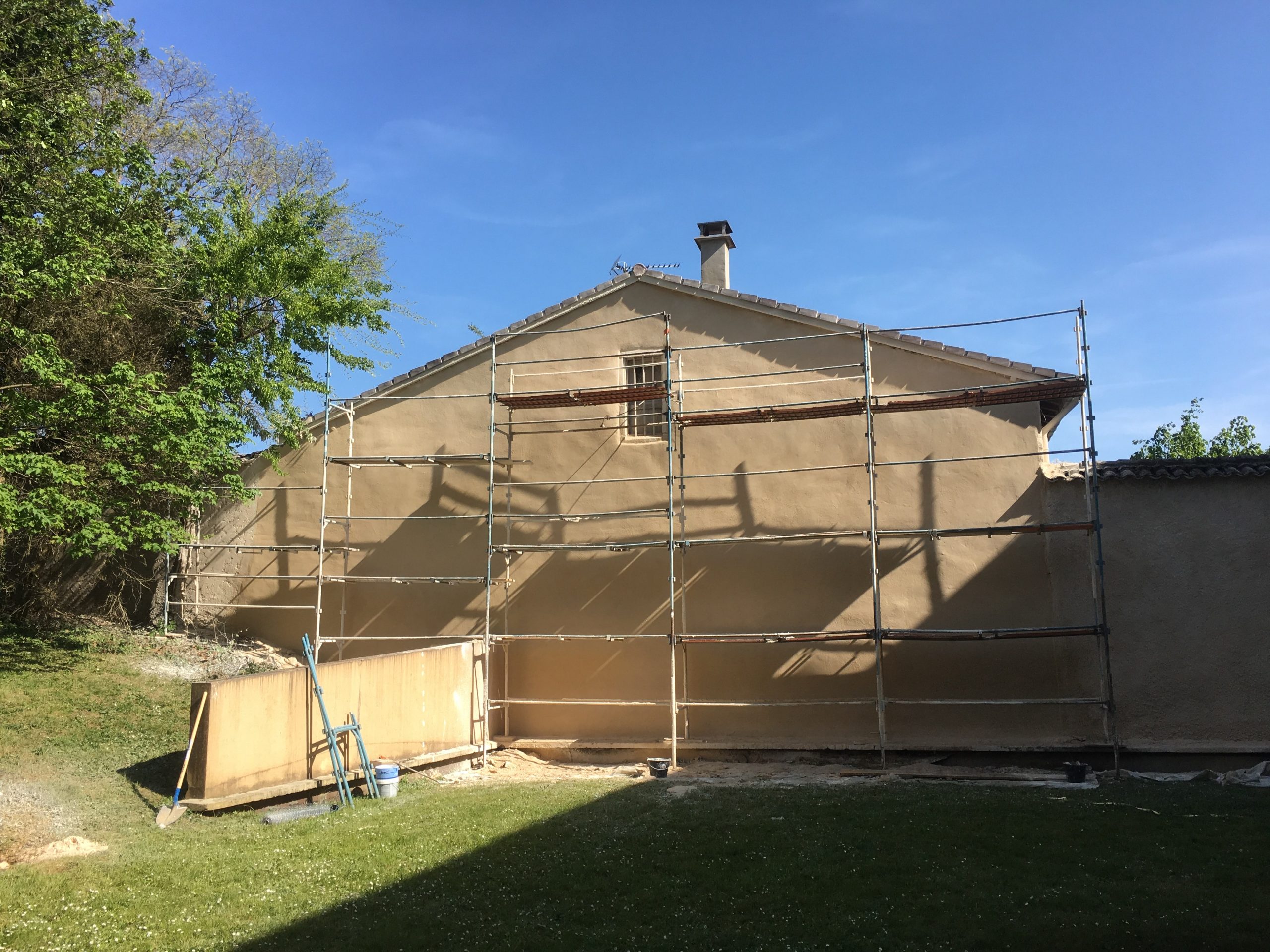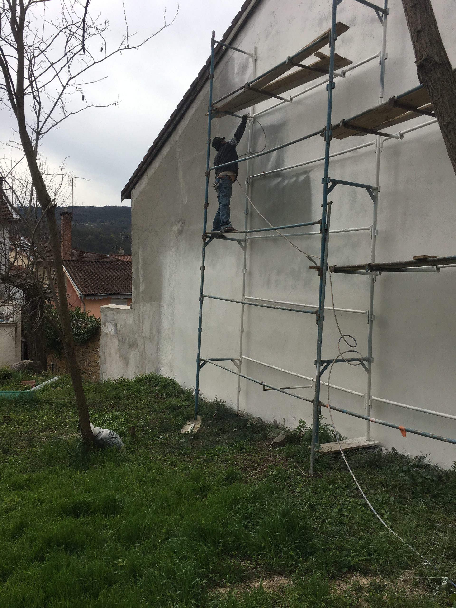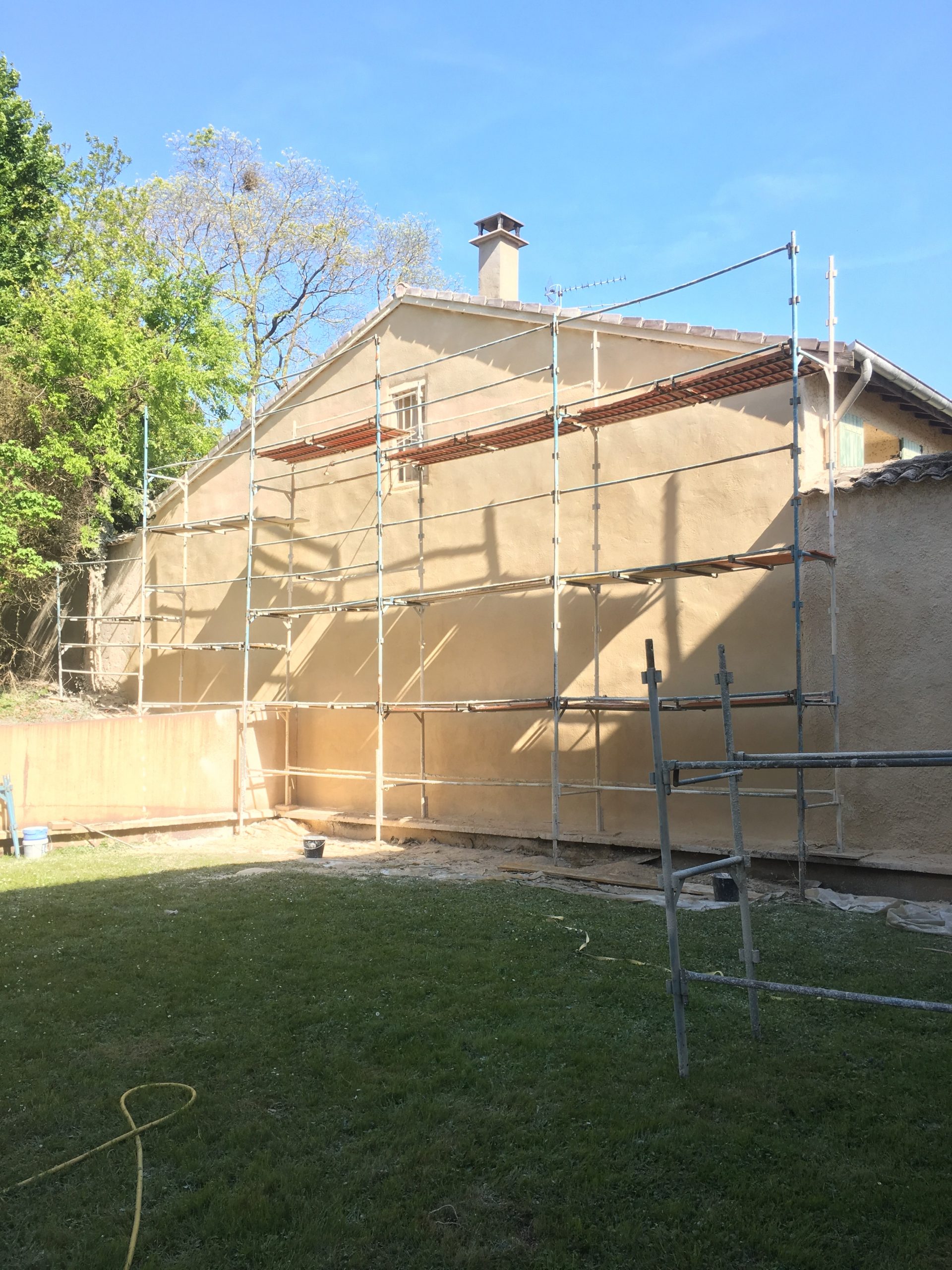 La façade, initialement très endommagée, a nécessité la mise en place d’un échafaudage pour permettre un accès sécurisé à toutes les zones à traiter. Ensuite, un enduit a été appliqué par projection à l’aide d’une machine motorisée, garantissant une couverture uniforme et une finition durable.