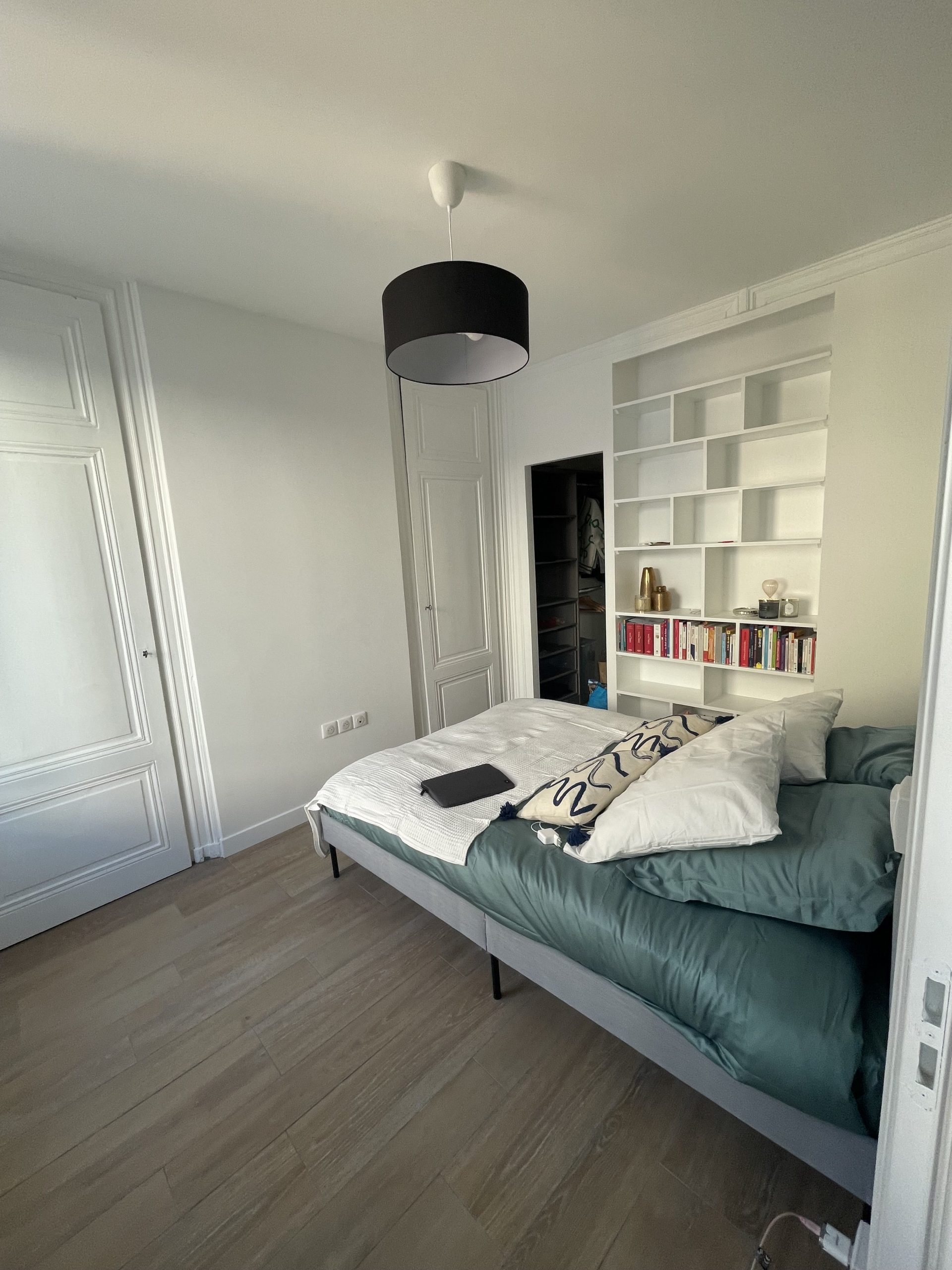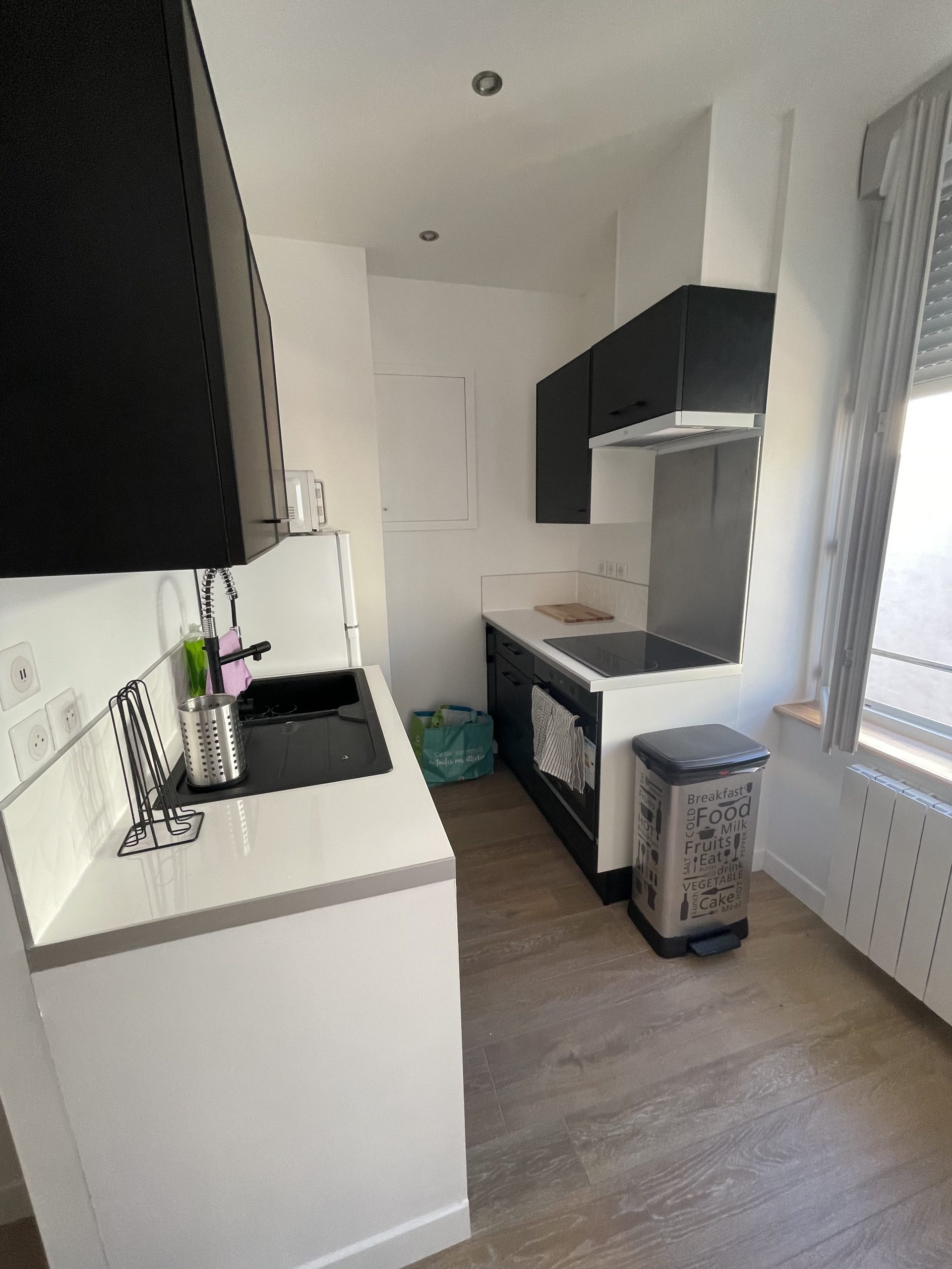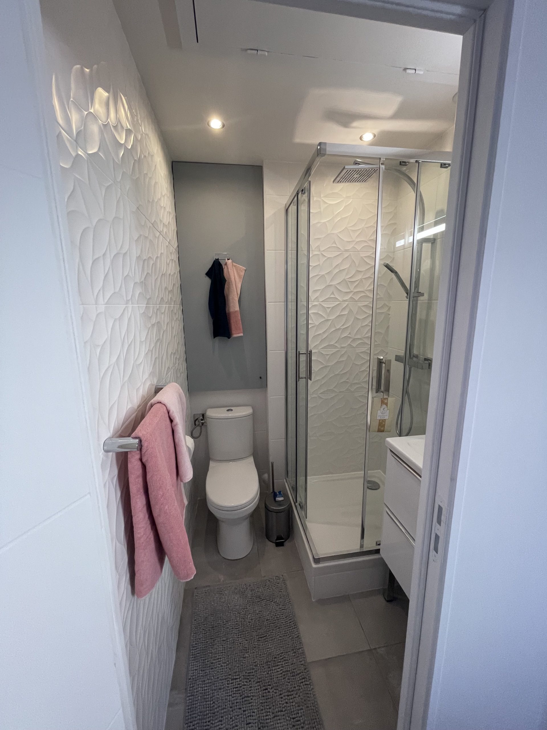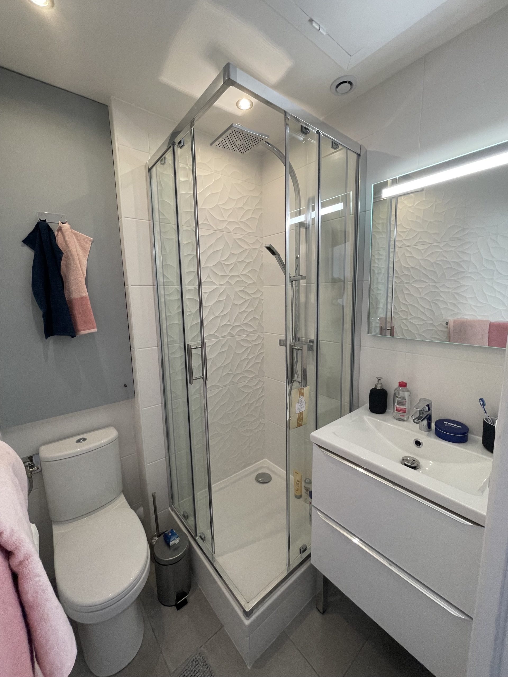 Nous avons redistribué les pièces pour une meilleure fonctionnalité. Le sol a été entièrement revêtu de carrelage effet parquet. La cuisine et la salle de bain ont été réalisées sur mesure.