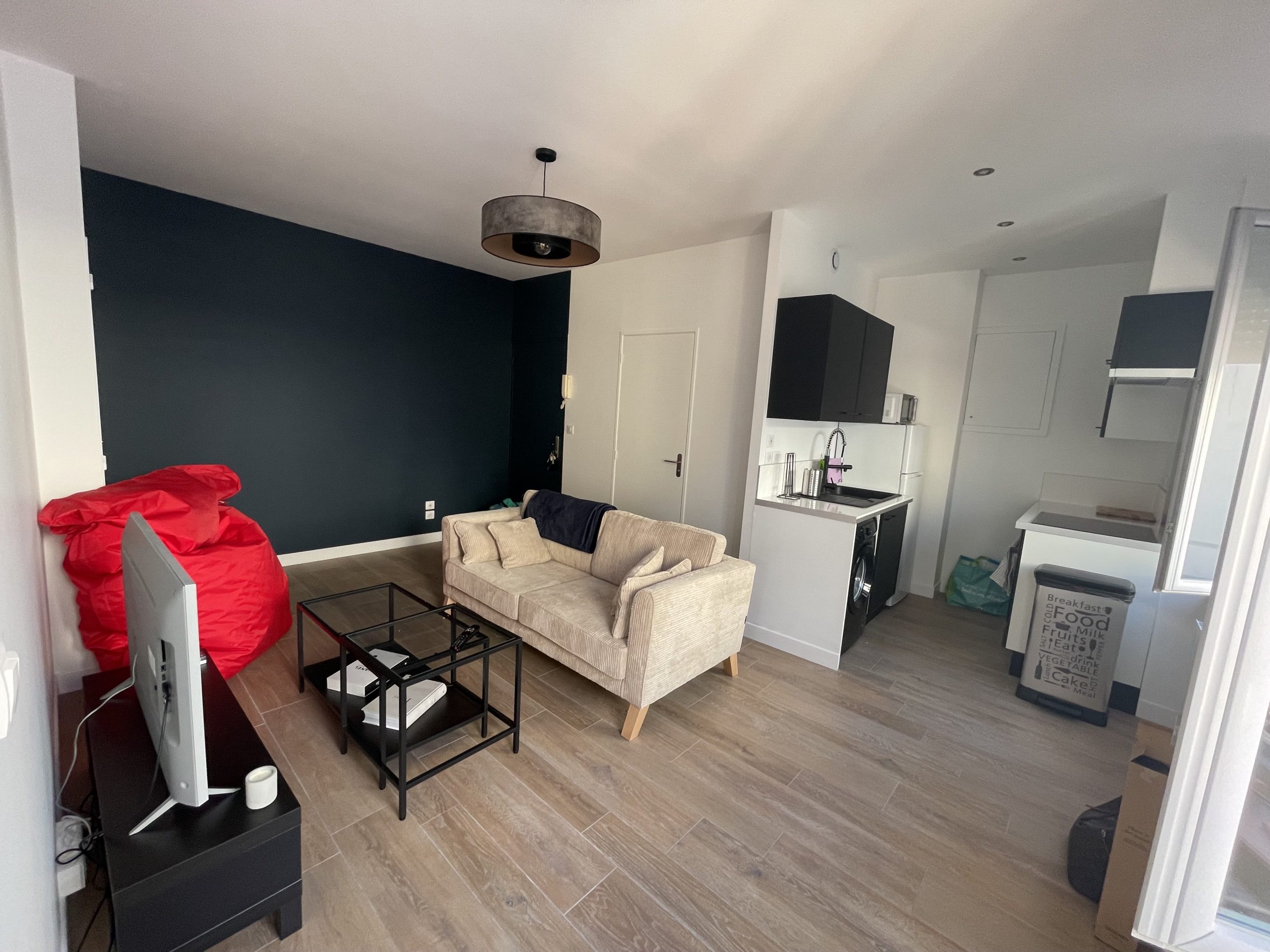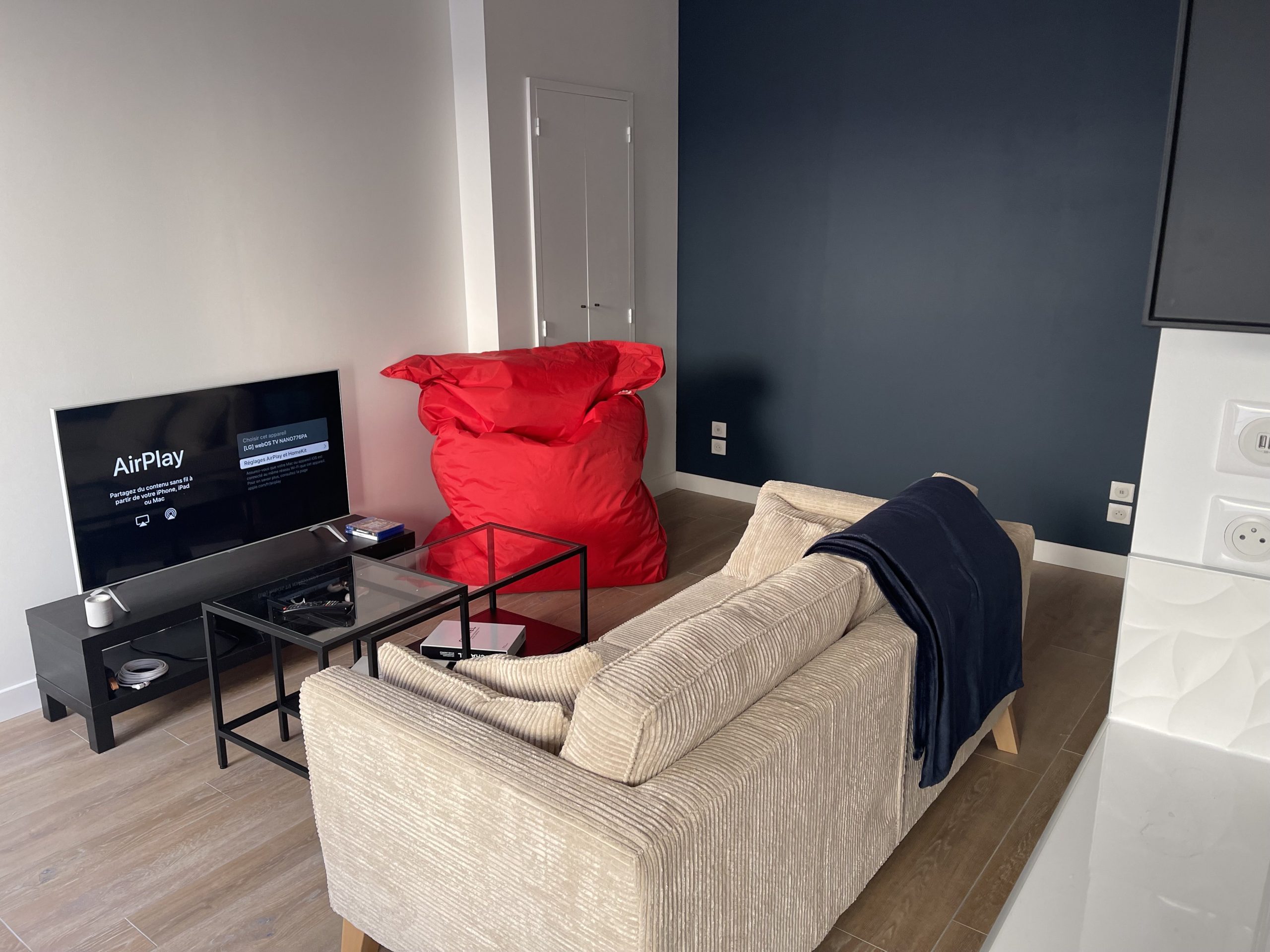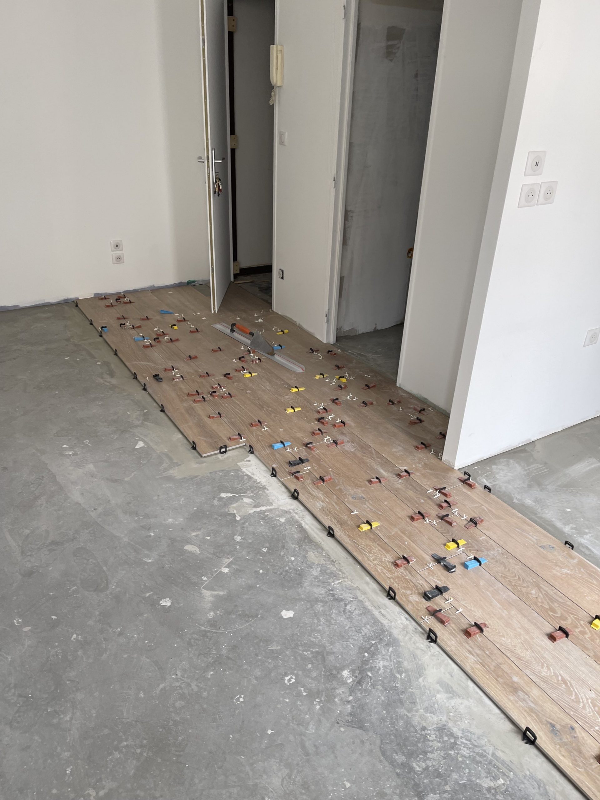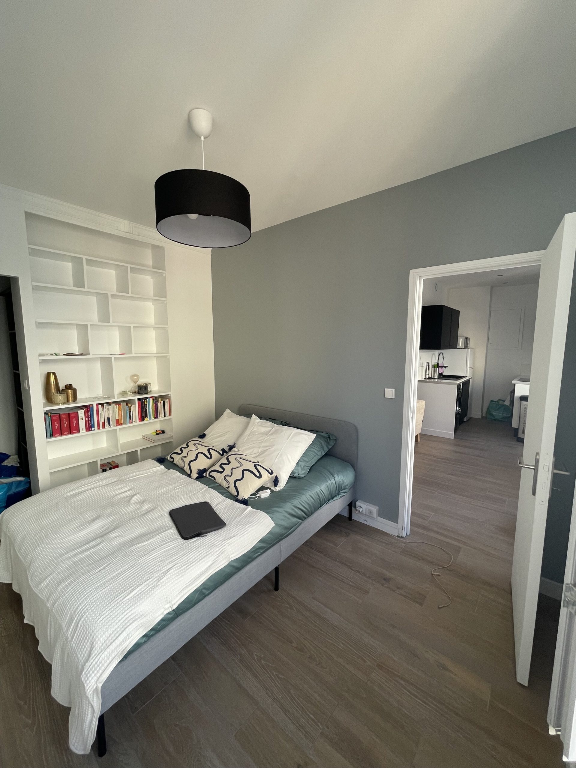 Nous avons redistribué les pièces pour une meilleure fonctionnalité. Le sol a été entièrement revêtu de carrelage effet parquet. La cuisine et la salle de bain ont été réalisées sur mesure.